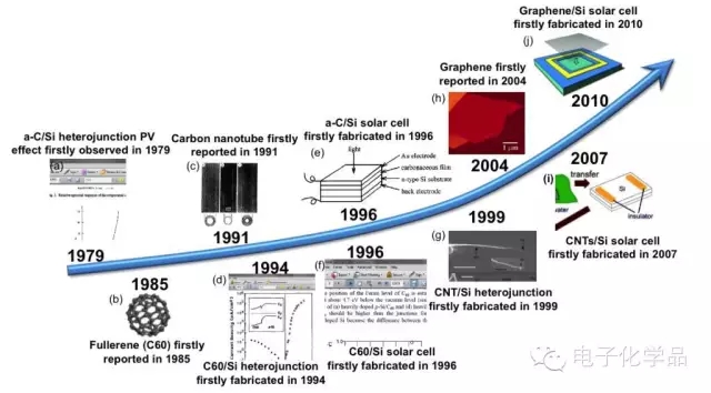 碳/硅异质结最早于1979年由G. K.Bhagavat 和K. D. Nayak在实验中实现,并发现该结构具有光伏效应(Thin Solid Films 1979, 64, 57)。其后,随着碳材料的制备与加工技术的发展,碳/硅异质结的研究逐步深入,并得到广大科学家的关注与持续研究。1996年,H. A. Yu等人基于该异质结实现了具有3.8%光电转化效率的非晶碳/硅太阳能电池(Appl. Phys. Lett. 1996, 68, 547)。同年,K. Yamada等人报道了富勒烯/硅太阳能电池模型(J. Appl. Phys. 1996, 79, 2798 )。由于非晶碳与富勒烯材料电学性能调节的限制,其与硅构建的太阳能电池的研究进展较为缓慢。