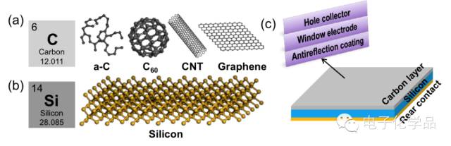 图2 (a) 碳与(b) 硅的结构示意图;(c) 碳/硅异质结太阳能电池的结构示意图